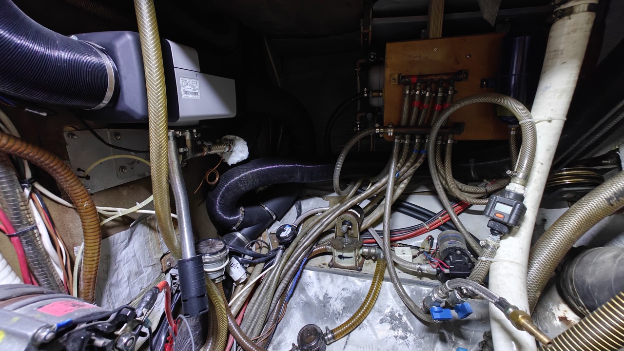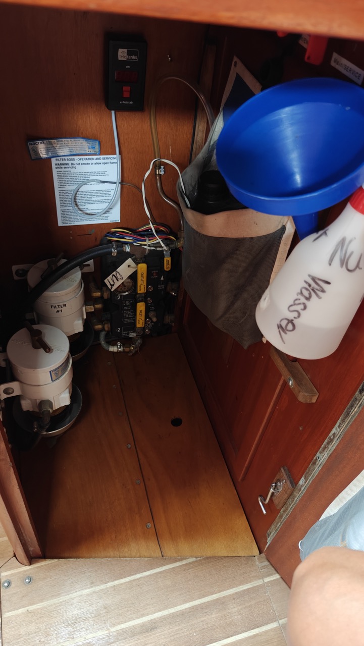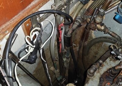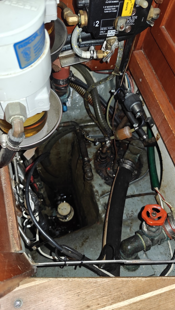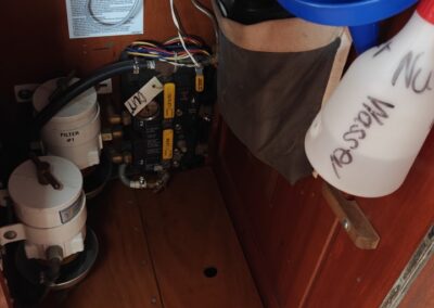 Sie sehen links in den Bildern die Chromstahlstangen an welchen die zweite Bilgepumpe (weiss) und der Bilgepumpensensor angebracht sind. Diese kann man losschrauben und das ganze so herausnehmen. Pumpe wurde das letzte mal im 2023 gereinigt und auch der Sensor ausgewechselt (zwei weitere als Reserve an Bord) da die Anoden wegkorrodiert waren.